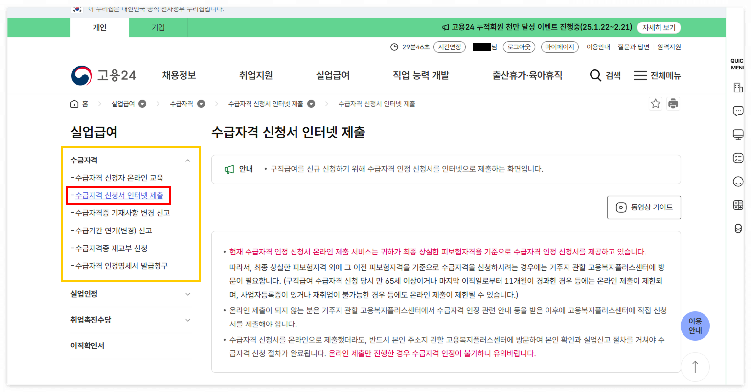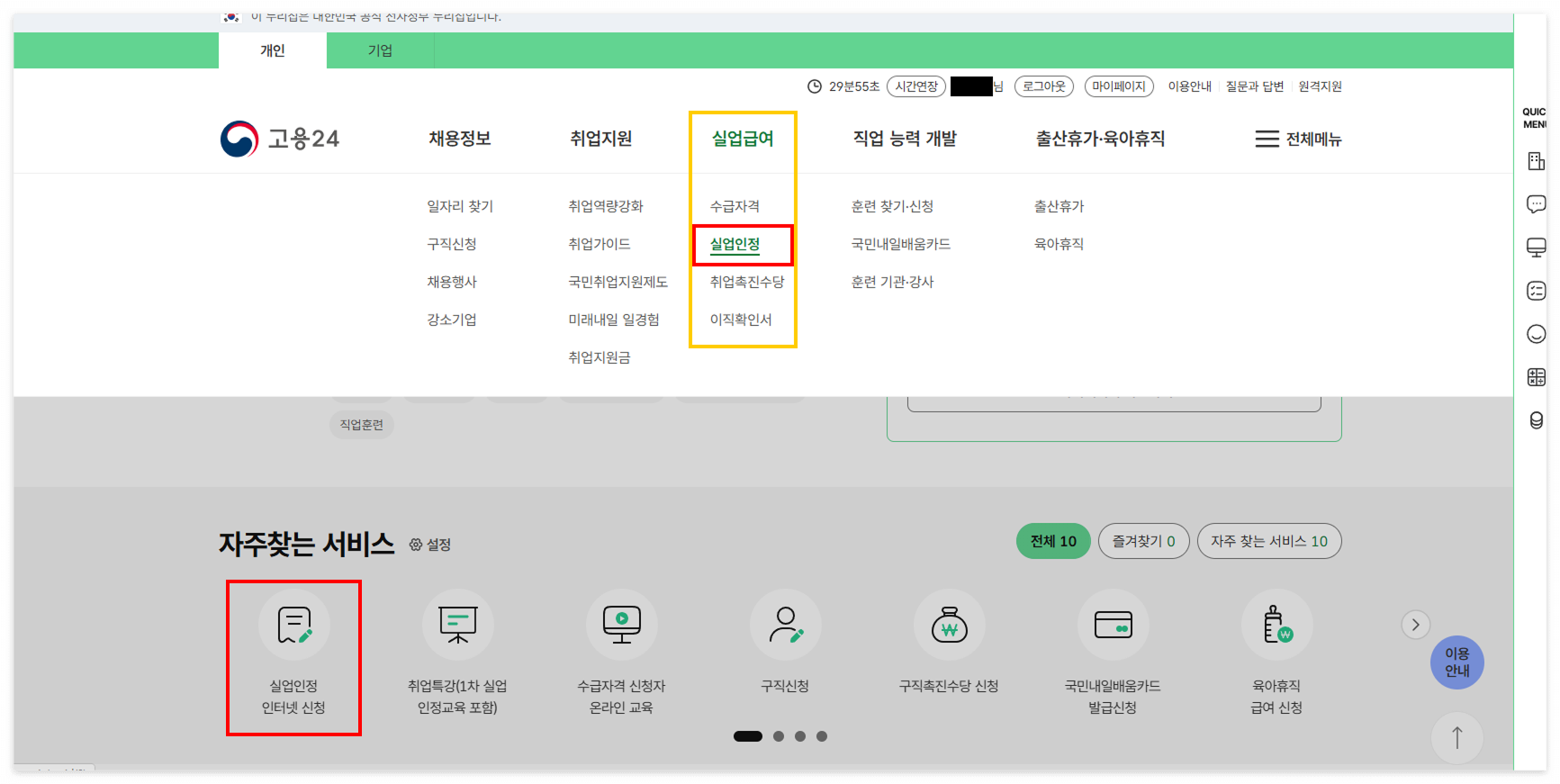 고용24 > '자주찾는 서비스' > '실업인정 인터넷 신청'
